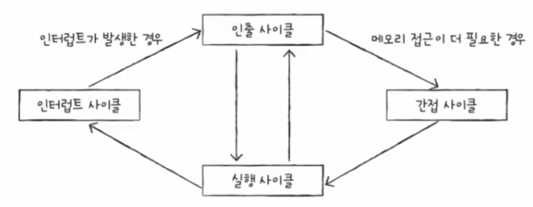 - 간접 사이클 : CPU로 명령어를 가지고 와도 바로 실행이 불가능한 경우(추가적으로 메모리에 접근해야 하는 경우) 간접 사이클이 추가된다.