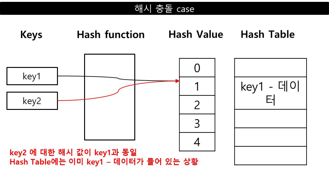 - 서로 다른 키의 해시 함수를 통한 해시 값이 동일한 경우
