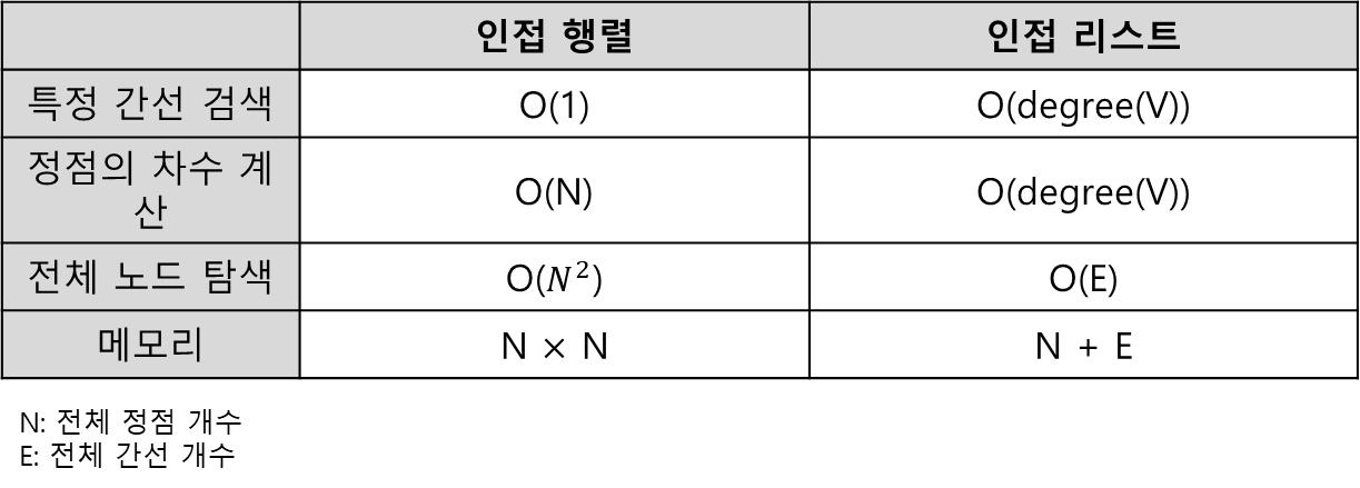 - 노드 간의 연결 여부를 확인하기 위해 O(degree)의 시간이 소요된다. (degree: 노드의 차수)