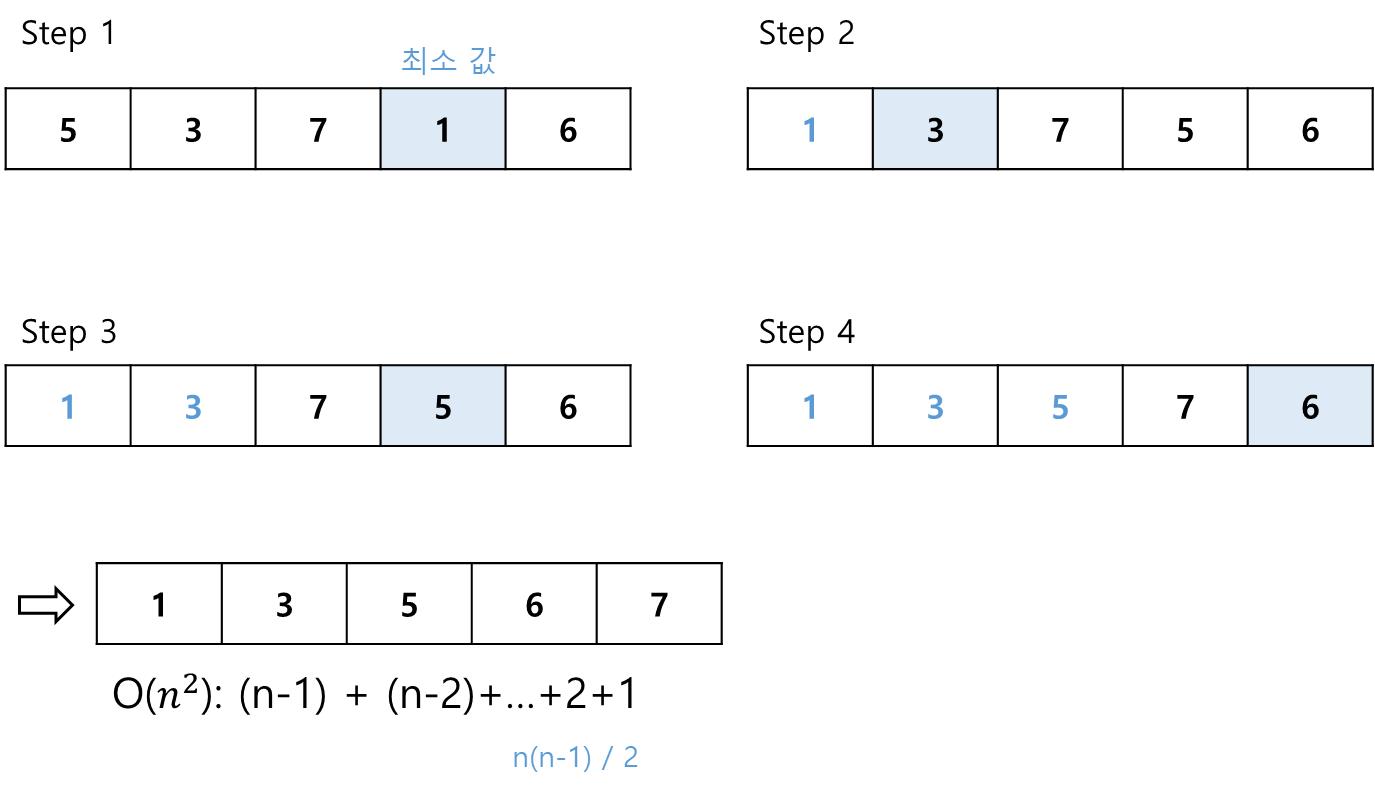 시간복잡도 : (n-1) + (n-2) + ... + 2 + 1 -> n(n-1)/2 즉, O(n^2)