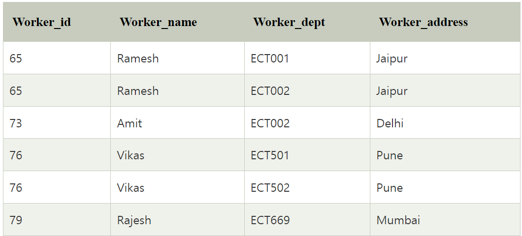 - 예를 들어, 위의 표에서 부서 번호 ECT669를 삭제하려면 Rajesh의 세부정보가 ECT669 행에 따라 달라지기 때문에 Rajesh의 세부 정보도 삭제된다. 따라서 표에 삭제 이상이 발생한다.