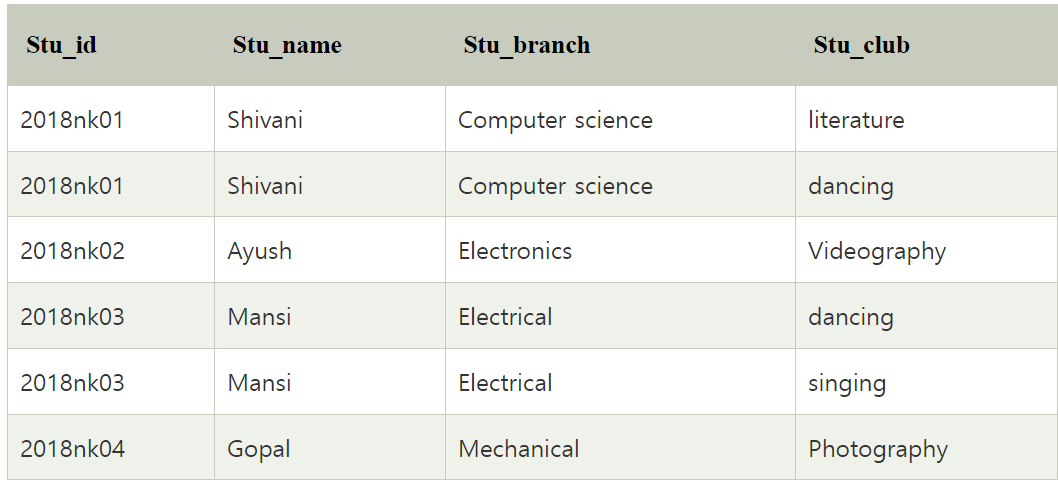- 위의 표에서 Shivani가 Computer Science에서 Electronics로 branch를 변경하면 모든 행을 업데이트해야 한다. 행을 하나라도 놓치면 Shivani는 두 개 이상의 branch를 가지게 되므로 갱신 이상이 발생한다.