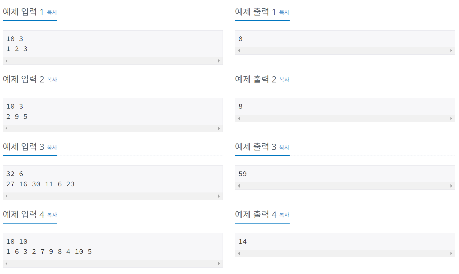 첫째 줄에 큐의 크기 N과 뽑아내려고 하는 수의 개수 M이 주어진다. N은 50보다 작거나 같은 자연수이고, M은 N보다 작거나 같은 자연수이다. 둘째 줄에는 지민이가 뽑아내려고 하는 수의 위치가 순서대로 주어진다. 위치는 1보다 크거나 같고, N보다 작거나 같은 자연수이다.