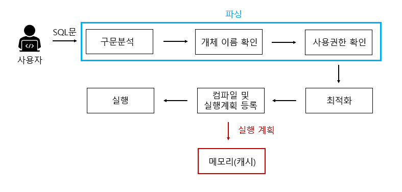 실행 과정 : 파싱 → 최적화 → 컴파일 및 실행계획 등록(실행계획 결과 메모리에 등록) → 실행
