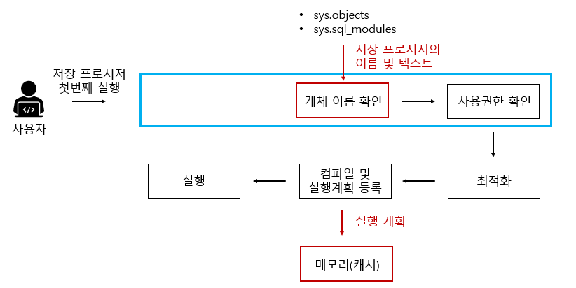 구문분석 단계가 빠지는 것만 제외하면 일반적인 쿼리문 수행단계와 동일하다. 저장 프로시저 정의 단계의 지연된 이름 확인에서 하지 않았던 개체 존재를 개체 이름 확인을 통해 수행한다.