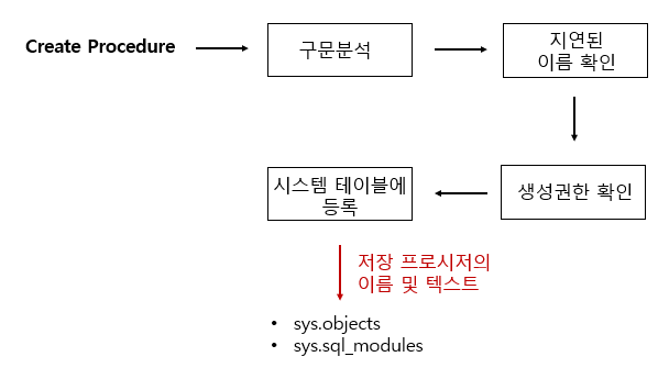 - 생성권한 확인 : 저장 프로시저를 생성하는 사용자가 해당 작업을 수행할 권한이 있는지를 확인하는 단계이다. 만약 사용자가 권한이 없다면, 저장 프로시저는 생성되지 않는다.
