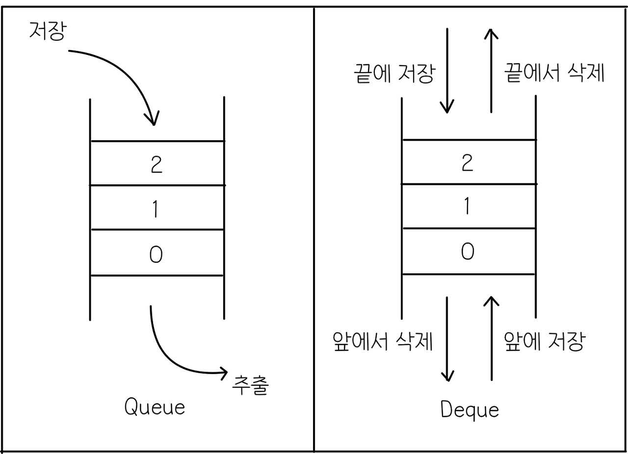 - Double-Ended Queue 즉, 양쪽 끝에 추가/삭제가 가능하다.