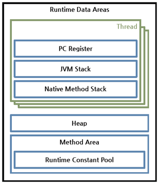 런타임 데이터 영역은 JVM의 실행 중에 할당되고 사용되는 메모리 영역을 나타낸다. 6개의 영역으로 나눌 수 있는데 이중 PC 레지스터, JVM 스택, 네이티브 메서드 스택은 스레드마다 하나씩 생성되며, 힙, 메서드 영역, 런타임 상수 풀은 모든 스레드가 공유해서 사용한다.