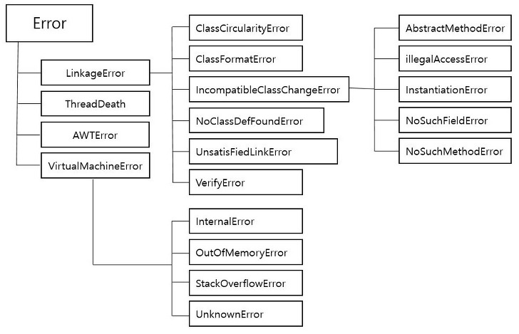 - Error는 주로 시스템 레벨에서 발생하며, 개발자가 직접 제어할 수 없는 문제를 나타낸다.
