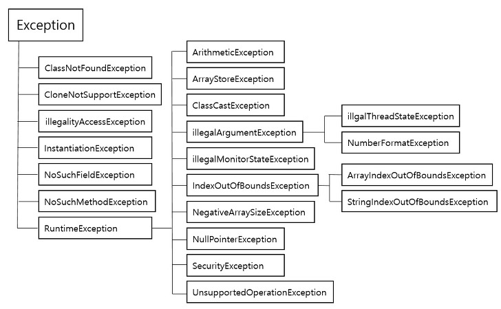 - ex) NullPointerException, IndexOutOfBoundException, etc.