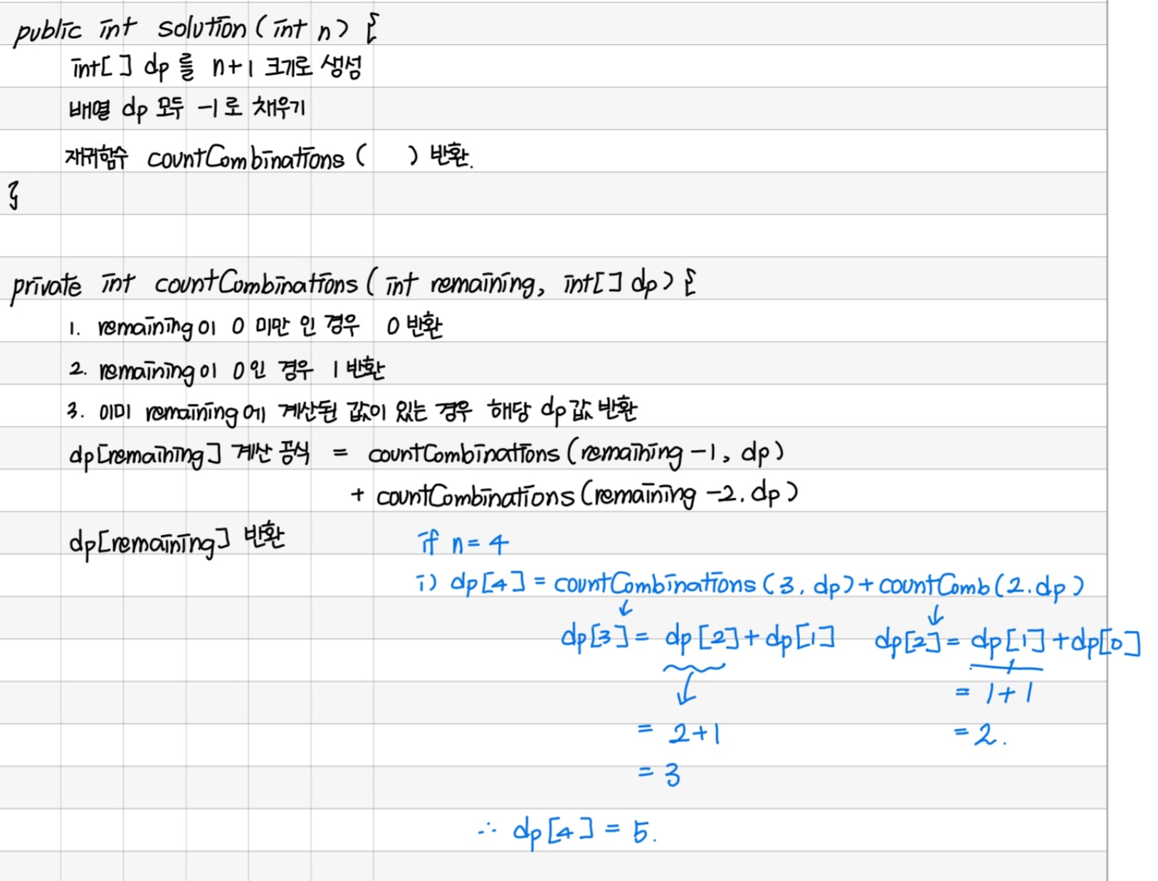 dp[remaining] = countCombinations(remaining -1, dp) + countCombinations(remaining -2, dp);