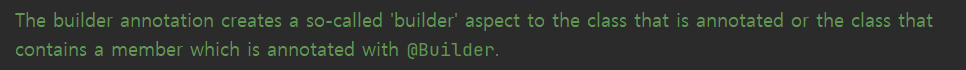 - 스프링 부트에서는 @Builder 어노테이션을 사용하여 쉽게 객체를 생성하고 값을 넣을 수 있는데 생성 패턴 중 하나인 Builder 패턴을 쉽게 사용할 수 있도록 구현되어 있는 것입니다.