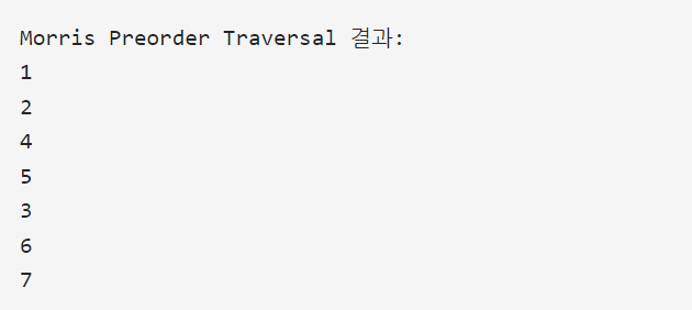 다음은 Morris Traversal 알고리즘을 사용하여 이진 트리를 Preorder 순회하는 예시 코드입니다.