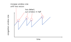 - 감소 단계 (Multiplicative Decrease) : 혼잡을 감지하면 송신 윈도우 크기를 절반으로 줄인다. 이는 네트워크 혼잡을 피하기 위해 데이터 전송 속도를 감소시키는 역할을 한다.