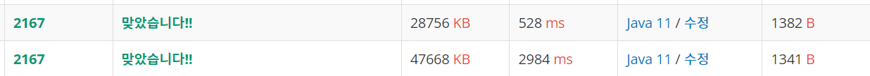 통과는 했지만 시간이 너무 오래 걸려서 다이나믹 프로그래밍을 사용하여 다시 풀었다.